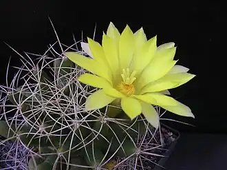 Каждый сосочек увенчан маленькой ареолой, из которой растут мягкие жёлтые колючки. Обычно это 8—10 шилоподобных, прямых или слабо изогнутых радиальных колючек, которые имеют от белого до бледно-коричневого оттенка, длиной 12-20 мм, и одна центральная, беловатая с тёмными концами колючка длиной до 3 см.