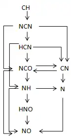 Образование NOx по быстрому механизму связано с реакцией радикала CH, который присутствует только в начальной зоне разложения углеводородных топлив, с молекулярным азотом: