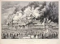 New York Crystal Palace был уничтожен пожаром 5 октября 1858 года во время проводившейся здесь ярмарки Американского института. Пожар начался в кладовой, через пятнадцать минут обвалился купол, а через двадцать пять минут вся конструкция сгорела дотла. Никто не погиб, но материальный ущерб составил более 350 000 долларов — в эту сумму входила стоимость самого дворца, оцененное в 125 000 долларов, а также экспонаты и ценные скульптуры, оставшиеся от Всемирной выставки.[2]