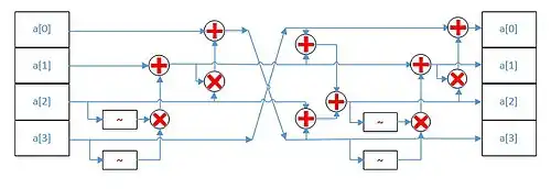 Алгоритм NOEKEON[4] выполняет 16 раундов преобразований с последующим применением функции Theta. Блок входных данных State представляет собой четыре 32-битных слов от a[0] до a[3].