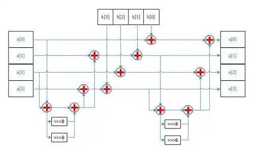 - Первое слово входных данных складывается с помощью операции XOR с раундовой константой RC[r], где r — номер текущего раунда.