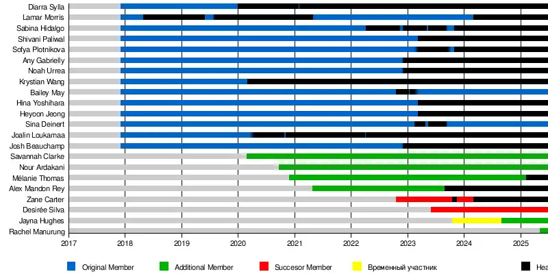 | Номер | Участник | Оригинал имени | Страна, регион | Дата рождения | Место рождения | Активность | Статус в группе |
