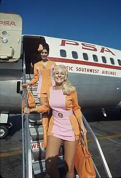 Для обслуживания новых самолётов была изменена униформа стюардесс, которая ещё в 1962 году стала облегающего фасона и более ярких цветов, получив при этом прозвище «банановая кожа», а в 1965 году впервые в авиации появились мини-юбки. Собственно PSA активно использовала сексуальность стюардесс в качестве рекламы, что действительно привело к высокой известности девушек авиакомпании, которые даже летали во Вьетнам в период военных событий для поднятия духа американских солдат. Конкурс на стюардесс был высоким, но из-за высоких требований, средний период их работы в PSA составлял 9 месяцев[3].