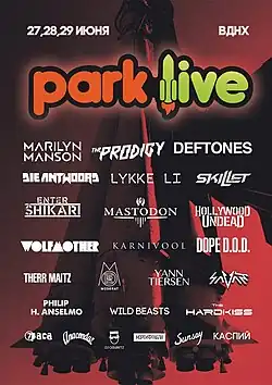 Летний фестиваль Park Live — новый формат уже известных слагаемых: музыка, творчество, развлечения, солнечный свет, свежий воздух, умная публика и позитивная атмосфера. Объединяющим фактором стала выбранная площадка для фестиваля: Всероссийский Выставочный Центр, место, изначально сочетающее в себе историю и пространство, культуру поколений и масштабное её воплощение. В 2015 году фестиваль проходил на стадионе «Лукойл Арена». Park Live — фестиваль, существующий вне рамок и стилевых ограничений. Park Live предназначен для зрителей самых разных возрастов и музыкальных пристрастий. В 2014 году фестиваль должен был пройти в Киеве, но был отменен из-за политической обстановки в стране. В разное время фестиваля, хедлайнерами становились System Of A Down, Limp Bizkit, The Killers, Pendulum, Земфира, Мэрлин Мэнсон, The Prodigy, Deftones, Muse, Red Hot Chili Peppers и Лана Дель Рей. В 2014 году произошёл крупный скандал с отменой концерта Мэрлина Мэнсона. В конце ноября 2017 года было объявлено, что в 2018 году фестиваль пройдет на территории ЦПКиО имени Горького. В 2018 году, во второй день фестиваля, выступление группы Gorillaz было прервано из-за грозы и сильного дождя. В 2019 году, на фестивале должна была выступить группа The Prodigy, но в связи со смертью солиста Кита Флинта, группа объявила об отмене всех своих концертов, в том числе и в России. Вскоре, было объявлено, что их заменит хип-хоп группа из ЮАР Die Antwoord[1]. В 2020 и 2021 году фестивали были отменены в связи с пандемией COVID-19. В 2022 году фестиваль также не состоялся. В 2024 году фестиваль впервые прошел в Казахстане, в городе Алматы[2].