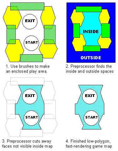 Кисти размещаются и поворачиваются так, чтобы создать закрытые, пустые, объёмные пространства. Когда дизайн карты закончен, эта карта пропускается через препроцессор рендеринга. Этот препроцессор используется для определения местонахождения двух типов пустого пространства на карте: пустого пространства, созданного кистями, в котором будет находиться игрок во время игры; и другого пустого пространства, которое находится снаружи кистей и которое игрок никогда не увидит. Потом препроцессор убирает невидимые поверхности с отдельных кистей, которые находятся вне игрового пространства, и оставляет только те полигоны, которые определяют лишь внешний периметр внутреннего игрового пространства — таким образом достигается значительная оптимизация движка, и как следствие, ускоряется его работа.