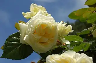 Цветки махровые, старинной формы, кремово-белые, желтовато-белые, в тени могут быть зеленовато-кремовыми, обладают фруктовым ароматом средней интенсивности. Диаметр около 12 см[7].