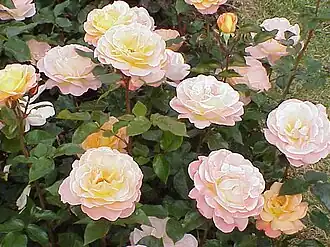 | 'Peace' Francis Meilland, 1939 чайно-гибридная, цветки жёлто-розовые | ||||||||||||||||