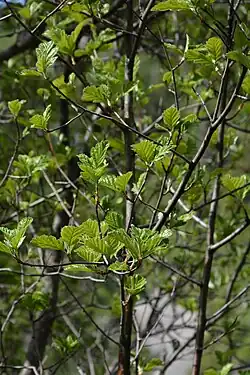 Дерево или кустарник от 5 до 12 м высоты. Листья простые 5-8,5 см длины, 3,5-5 см ширины, по краю 4-6 лопастные, наверху тупые или островатые, в основании клиновидно-суженные, листовая пластинка эллиптические или продолговато-эллиптические, сверху почти голые, снизу покрыты белым войлочным опущением, по краю косо треугольными зубцами, листовые черешки войлочно-опушенные 1-2 см длины.