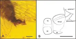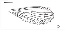 Длина переднего крыла 3,0 мм, ширина 1,1 мм (правое переднее крыло); удлиненно-яйцевидное, верхушка закруглённая, с плотными относительно короткими щетинками на жилках и более длинными щетинками по краям; мембрана с пятнистыми пятнами по всему крылу; трихозоры выступают по всей границе крыла. Плечевая жилка короткая и простая, не рецидивирующая, перпендикулярна ScP; костальное пространство узкое; субкостальные вены простые, не раздвоенные, птеростигмы нет. ScP и RA срослись дистально, войдя в край перед вершиной крыла. Есть только один sc-r. Четыре поперечных жилки ra-rp, самая дистальная поперечная жилка ra-rp, расположенная в месте слияния ScP и RA; RP отделена от RA непосредственно вблизи sc-r, с тремя ответвлениями. Конфигурация RP1 и RP2 похожа, дихотомически раздвоенная, RP3 с дистальной вилкой, примерно две поперечные жилки между RP1, RP2 и одна поперечная жилка между RP2, RP3. M, разделённая на MA и MP при 2 м-cu, вдали от отделения RP1 от стержня RP, присутствует одно поперечное сечение ma-mp; МА дистально раздвоен дважды, MP пектиново раздвоен, с двумя ветвями дистально; три r-m поперечины между RP и M; Cu разделен на CuA и CuP у основания крыла на уровне Начало RP, три поперечных жилки m-cu; CuA сильно раздвоена, с тремя (правое переднее крыло) или четырьмя (левое переднее крыло) простыми ветвями дистальнее 2m-cu; CuP простая, одна поперечная жилка между CuA, CuP; виден только один 2cu-aa; конфигурация AA1, AA2, AA3 аналогична, каждая с дистальной вилкой, между областями AA не обнаружено перекрёстных жилок[2].