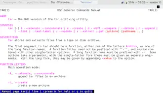tar(1)— страница справки man по пользовательским командам Plan 9 (англ.)tar(1)— страница справки man по пользовательским командам Solaris 10 (англ.)tar(1)— страница справки man по пользовательским командам FreeBSD (англ.)tar(1)— страница справки man по пользовательским командам OpenBSD (англ.)tar(1)— страница справки man для разработчика Linux — пользовательские команды (англ.)tar(5)— страница справки man по форматам файлов FreeBSD (англ.)- TAR - Windows CMD - SS64.com