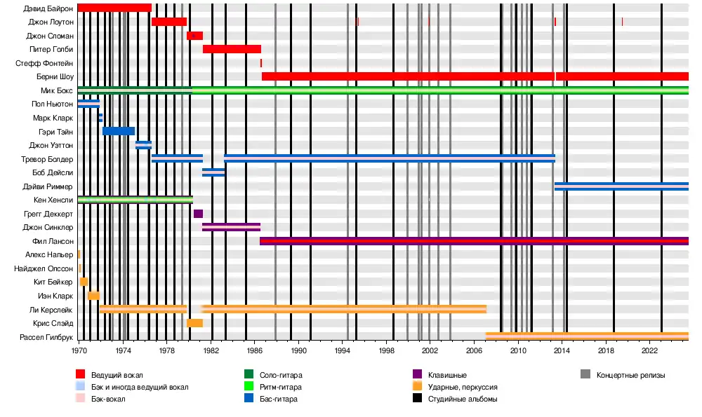 Тревор Болдер Кит Бейкер Кен Хенсли Пол Ньютон Алекс Нэпьер Дэвид Байрон Найджел Олссон Иэн Кларк Марк Кларк Ли Керслэйк Гэри Тэйн Джон Уэттон Джон Лоутон Крис Слэйд Джон Сломан Грегг Деккерт Питер Голби Джон Синклер Боб Дэйсли Стэф Фонтайн |